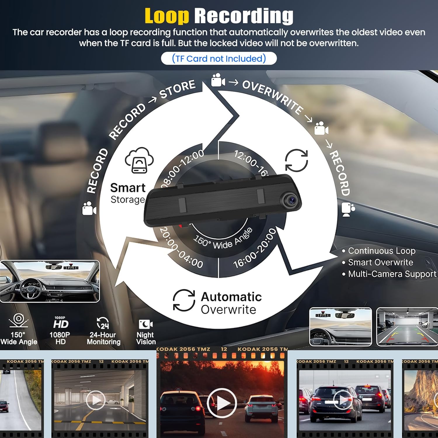 Loop recording means the unit overwrites the oldest files when the SD card is full—this Mirror Dash Cam explicitly states that in its description and warns users to save important videos regularly.